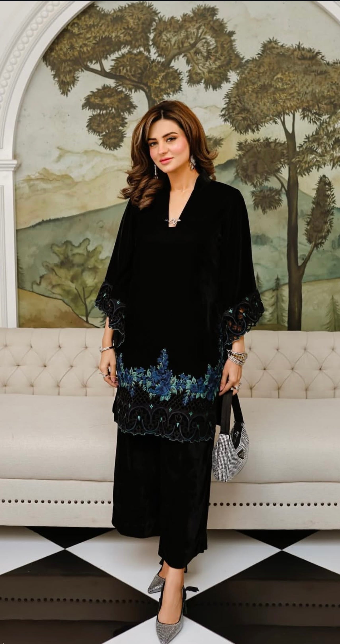 • Fabric & Color: The base is black velvet, providing a sophisticated backdrop that makes the detailing pop.